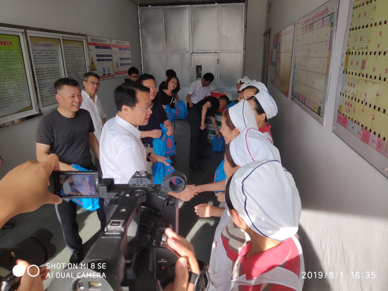 2019年建軍節(jié)下午,姜堰區(qū)區(qū)長冒著酷暑蒞臨江蘇泰達控股集團公司一分廠生產(chǎn)現(xiàn)場,為職工送清涼,慰問一線職工。